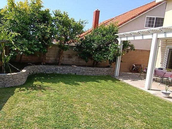 Two-story S&S Ponderosa home on a quiet cul-de-sac in La Palma in a peaceful, community-oriented neighborhood. It has a formal living room together with a formal dining area. It has a well-equipped kitchen with gorgeous backyard view window. Upgraded hardwood-style flooring in the entire house gives this house an elegant feel. Recessed LED lights throughout the entire house for energy efficiency. A formal family room with fireplace next to the kitchen is ideal for a family with small kids. Built-in bookshelves/cabinets on 2nd floor. One bedroom has a built-in desk. A well-shaded front yard and beautiful back yard built with a latticed patio ideal for family or friends getting together. There is a number of mature fruit trees in the backyard. Shutters and other window treatments are installed for all windows. No smoking is allowed, and the owner will provide gardener service. Some furniture and appliances (frig, washer, and dryer) are included. The garage door opener has MyQ remote control. It has central AC and attached 2 car garage. no smoking is allowed, owner will provide gardener service. some furniture and appliances (frig, washer and dryer) are includes .