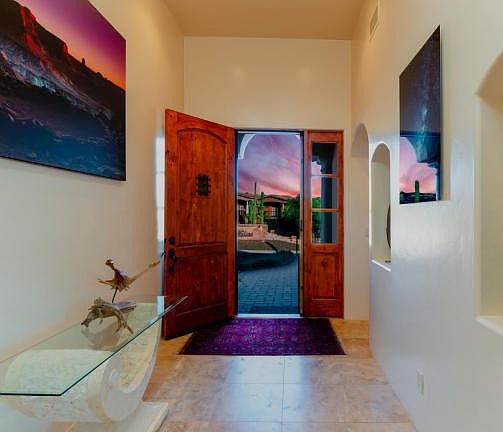 This elegant townhome is designed to exceed expectations in the coveted Sin Vacas community. 24 Hour manned security gate with stunning mountain, desert and city views. Single story 2 bed, 2.5 bath home with vaulted ceilings in the great room, alder wood cabinets and doors throughout. Travertine tile floors, granite counter tops, and top of the line GE Profile appliances. Split bedroom plan with two master suites and oversized walk-in closets. New A/C unit and water filtration system installed in 2017. Enjoy the beauty of the Catalina Mountains on this corner lot with a cozy front patio and an oversized rear patio for ultimate relaxation. Located directly across from the community pool. This is not a house you want, but a home you have been searching for. Don't Delay!