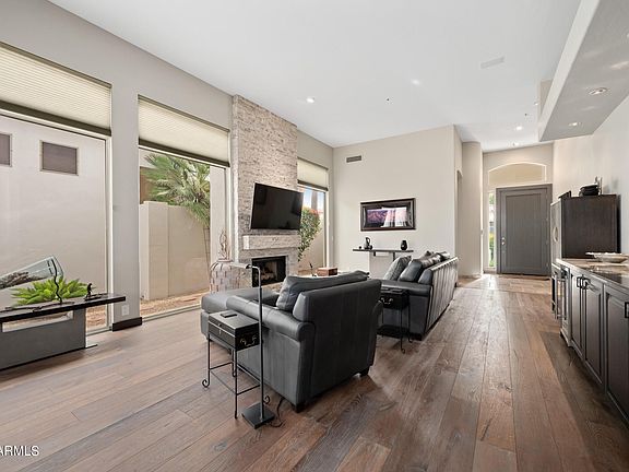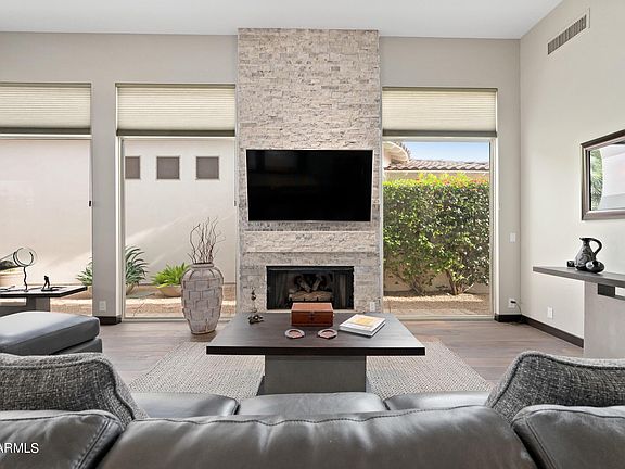 Call now to see this fantastic gem. This one-of-a-kind home located in a hidden, gated paradise of 7600 Lincoln will not last.Enter the doors of this bright, fully remodeled home with a modern elegance that offers vaulted ceilings, floor to ceiling windows to allow the outside in your main living space, that open to an all glass addition that you will not find in any other home in the community. Perfect for entertaining, this beautiful property offers wood flooring in the main living areas, gorgeous Italian Travertine tile in entry, laundry room and both bathrooms. Lush carpet in the master suite and guest bedroom, as well as two gas, log fireplaces with grey and white chiseled marble and inlaid Travertine.Prepare to be impressed when you enter the brilliant chef's kitchen with ple cabinets, under-mount lighting, stunning granite counter tops and a great island to prepare the most extravagant meals. All black stainless steel Samsung appliances including a gas cook-top with 8' exterior vented hood. You will be impressed and proud to entertain while you dine in the kitchen or fully enclosed glass room addition looking out to the backyard while relaxing to the sounds of the water feature. Walk into the main living area that offers additional cabinetry with an under counter bar refrigerator. Within the beautiful granite topped cabinets is a centrally controlled, whole-house audio system. Enter the spectacular master suite through the new, tall Sun Mountain doors to discover a personal fireplace, walk in closet with a beautiful Sun Mountain barn door entry, and completely upgraded bathroom with custom stand-alone tub and zero edge walk-in shower. All new cabinets with matching granite counter-tops and dual sinks separated by a vanity space. High cut out windows let in all the natural light without compromising your privacy. Plus, your own private backyard access doorway adorned with 10' Restoration Hardware linen drapes hanging from a custom iron rod. The home is complete with a spacious laundry room boasting plenty of cabinet space and separate sink with granite countertop. The guarded entry community offers lush landscaping, a community pool, pergola and courts, which are all part of your new home's amenities. You will feel right at home the minute you move into this friendly, private, quiet community that offers easy access to the miles of Greenbelt area of Scottsdale. Call to see your future home today!