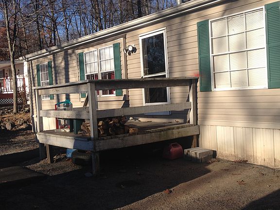Must see! Perfect home for first time home buyers. Nestled in the trees this adorable 3 bedroom, 2 full bath ranch is located in a private and peaceful community by a well-managed association. Nice sized living room and kitchen, laundry room with entrance to exterior deck. The Master bedroom is complete with walk-in closet and a private full bath. The opposite side of the home boasts another 2 bedrooms and a full bath. Recently installed wood fire stove heats the entire home and keeps you warm all winter! The community is tucked off the beaten path yet still easily accessible to major routes, all necessities and Pocono attractions! Price is perfect and taxes not too shabby! Schedule a showing and make an offer! Lot rent covers water, sewer, trash, recycle, main road maintenance and snow removal, as well as land taxes!