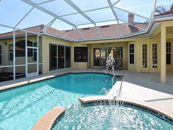 Pristine condition and owner's pride is reflected throughout this one owner Todd Johnston custom built home. Positioned on a private park like wooded setting, privacy and serenity are ensured. This three bedroom, den, living, dining and family room features an open floor plan with attention to detail. The bright entry foyer flows to the formal living room with fireplace, custom built-in bookcases, sliding glass doors to the lanai and opens to the formal dining room. The Chefs kitchen is the heart of the home with staggered wood cabinetry, center island, corian counters, large walk-in panty, computer/desk area, breakfast bar, casual dinette and opens to the spacious Family room. The sliding glass doors open to the extraordinary screened lanai with outside living area featuring a large heated pool, spa, outdoor kitchen and pool bath. The master suite with sitting area, huge walk-in closet and private bathroom with Roman style walk-in shower and separate tub. Other features you will discover include: den with French doors to the outside area, large laundry room, three car garage, 3 year new A/C, 1 year new hot water heater, extensive landscaping, neutral interior, gutters and more. This flexible open floor plan functions perfectly for both the family and entertaining large parties all in your private surroundings. River Club is a deed restricted golfing community with low HOA fees, No Cdd's, top rated schools, and ideally located with close proximity to shopping, restaurants, hospitals and entertainment.