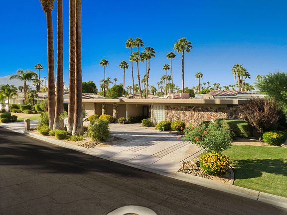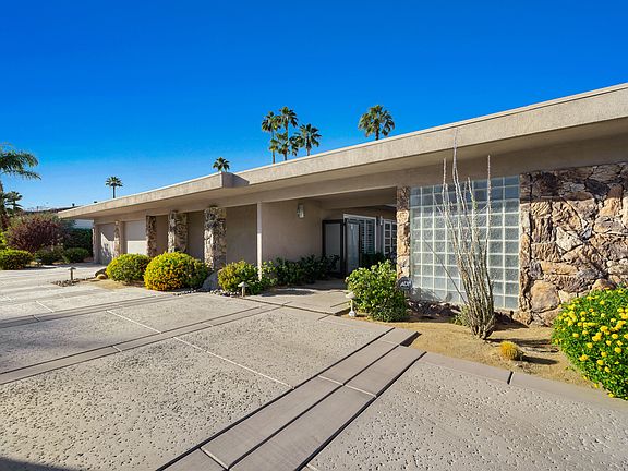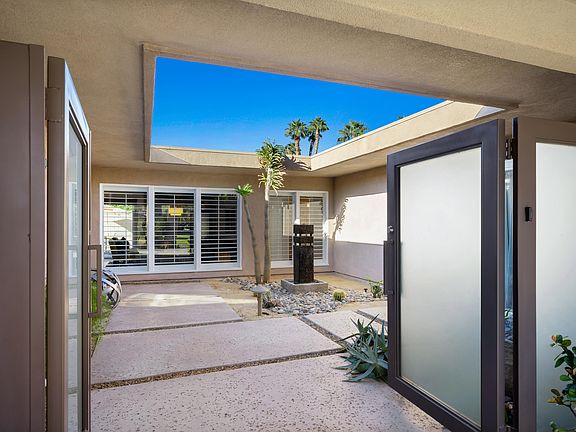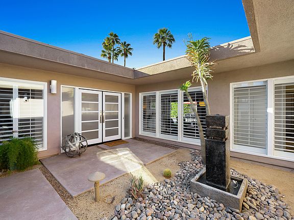 Welcome to Four Palms, your private desert oasis in Indian Wells. A courtyard entry with fountain beckons you inside this respectfully updated mid-century modern classic. Once inside the ideal circular floor plan emphasizes the ease of indoor/outdoor living. The light-filled living room flows to the comfortable dining room and fabulous kitchen with quartz counters, glass tile backsplash and large pantry. The den is off the kitchen and is accented with the original stone fireplace and flows to the entertainer's backyard with refinished saltwater pool, firepit and built-in grill. Beautiful mountain views frame this very private and spacious backyard. The large primary bedroom has room for a sitting area and opens to the front courtyard. A spacious bath rounds out this private retreat. Two additional guest bedrooms are spacious and comfortable and perfect for guests. The large hall bath has a tub and shower and access to the pool. An air-conditioned exercise room, accessed from the exterior, overlooks the pool and offers flexibility to create an office space without sacrificing space inside the house. There's a two car garage with epoxy flooring and air conditioning, perfect for your favorite automobile. The house has a built in sound system that includes the backyard. All mechanical systems and the roof are new as are most of the windows. Located in sought-after, non-gated Indian Wells with no HOA. Four Palms is a statement to understated swank and sophistication. Enjoy MCM.