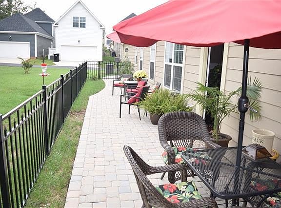 One level Villa with golf course view. Open kitchen and living room. Two bedrooms both with walk in closets. Two full bathrooms. Beautiful upgraded patio on golf course side of house. Front porch with rock columns, upgraded with slate rocks. Two car garage with extra shelves for more storage. Pull down door that leads to attic that has extra flooring for storage . Extra insulation was adding to help with weather changes in attic and garage. Large closet in hallway leading to laundry room.