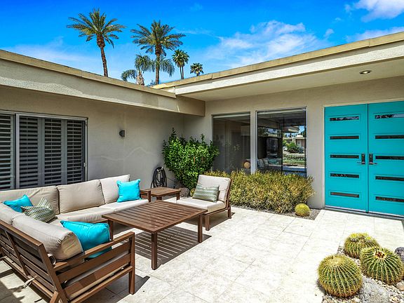 A Peaceful Pristine Oasis describes this aesthetically appointed home with MASSIVE MOUNTAIN and WATER VIEWS in Indian Wells! A highly sought after Interior location, sporting significant Mid Century Modern Design. Enter your home though a generous gated courtyard, perfect for relaxing, looking at the mountains and sipping your morning coffee. Upon entry, Take note of the light and bright open great room with fireplace, dining area, floor to ceiling windows, pleasing kitchen and more! Embrace the wonderful separation of bedrooms with a private guest suite off of the kitchen and the primary suite and additional bedroom located on the opposite side of the home. PERFECT for hosting company! From the great room, step onto your back patio and experience the soothing sight and tranquil sound of flowing water overlooking a lush oasis. The ultimate setting to enjoy indoor/outdoor living! Complete with 2 GARAGE SPACES and offered FURNISHED! Ready to enjoy NOW! With multiple Pools/Spas, Tennis, Pickleball, a 3 Hole Pitch 'n Putt; Casa Dorado offers an upbeat vibrant vibe! As a resident in Indian Wells, enjoy discounted Golf, use of the Gym at the Hyatt and More!