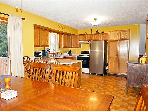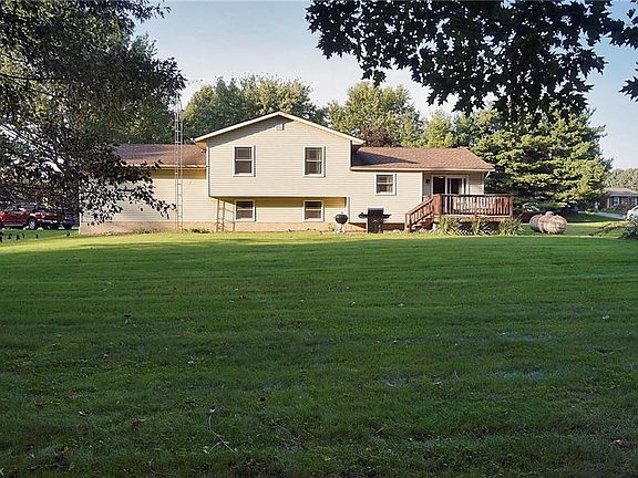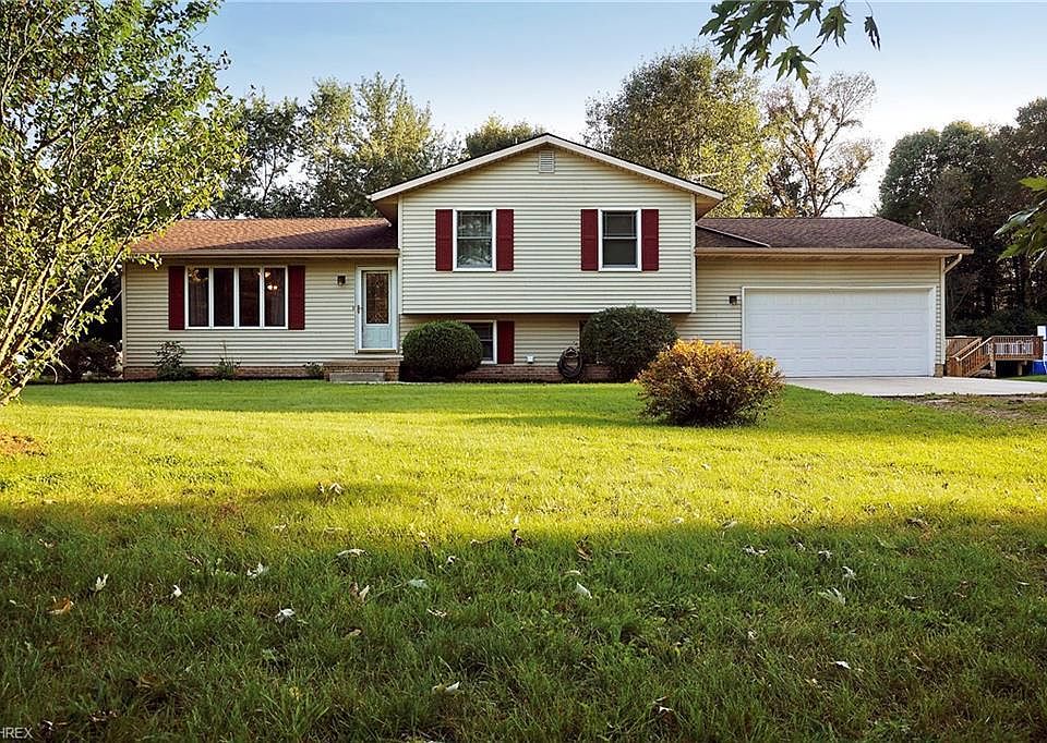 THE COUNTRY SETTING SPLIT LEVEL: Enjoy this Campbell built, 3 bedroom, 2 full bath split level home with a 2 car garage and large basement. Open the beautiful leaded glass front door to reveal a long foyer which leads to a bright spacious living room with large picture window & beautiful oak eat-in-kitchen featuring Pergo wood parquet floors. From the kitchen there are views of the big green back yard lined with trees to the south. Up stairs, you'll find newer carpeting (???11-???12) in the hallway that takes you to a main bath with pretty vinyl flooring, full bathtub & shower. The master bedroom also has a door that provides private access to the main bathroom. 2 nice size bedrooms with double-wide closets finish out the 2nd floor. The lower level houses a comfortable family room with newer carpeting (???07); open utility room/laundry room combo off of the garage entrance lined with newer modular carpet; as well as another full bathroom equipped with a step-in shower. Additional stairs go down to the basement that's perfect for storage. Newer 80-gallon hot water tank & sump pump (???15-???16) were installed. All new Pella windows & sliding glass door installed (???09-???10). Ceiling fans & double-wide coat closets throughout. Partial concrete drive & side walks (???13). A dimensional roof (???08) protects the home & warranty is transferable. Relish in the country setting of the back yard while on the deck & patio. Cul de sac at end of street. Check out this private neighborhood yourself!