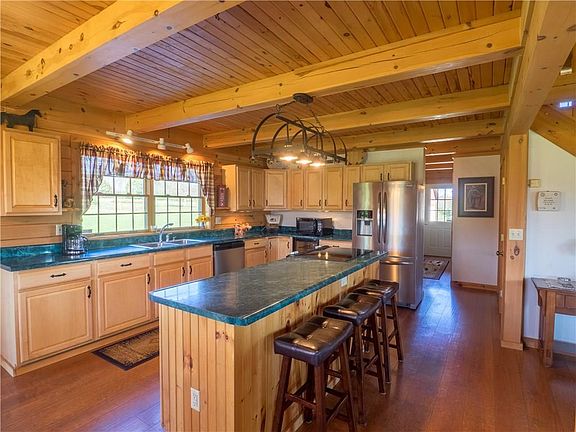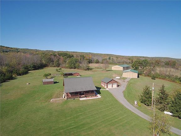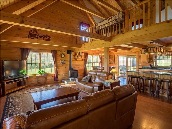 ***HORSE LOVER'S PARADISE*** The country estate you've always dreamed of! Gorgeous 2002 built, year round log home on 15+ acres. 2 bedroom, 2 full bath with additional bedroom possibilities. Open floor plan, loft, huge kitchen, island, stainless appliances, wine chiller, lots of cupboard & counter space. Stay cozy on cool nights curled up in front of the gas fireplace. 7200 sq ft indoor riding arena, large workshop with hydraulic lift, 3 stall horse stable with tack room & hay storage, pastures, paddock, shed with fenced area, 2 ponds. Security system. Enjoy views of the Southern Tier hills while sitting on your front porch. Large rear patio for those weekend Bar-B-Qs. Full walk-out basement with pellet stove. Close to State Land. 18 miles to Corning & Watkins Glen.