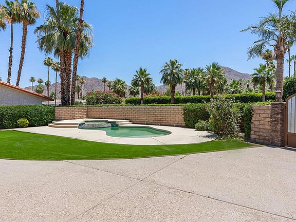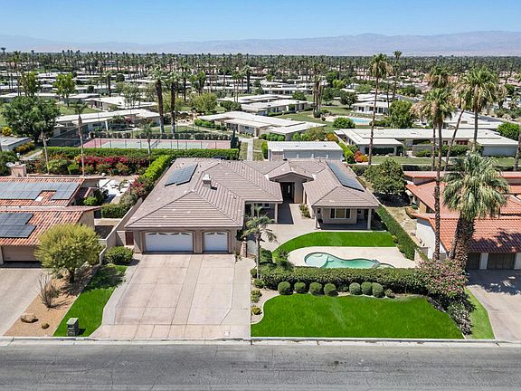 Located in the heart of Indian Wells on a highly sought-after street, this custom-built, solar-powered residence is making its debut to the market. Boasting a spacious floor plan of nearly 4,000 square feet, the home offers stunning direct mountain views to the south, perfect for enjoying by the poolside. Notable features of this property include a generous chef's kitchen with ample storage and countertop space, conveniently connected to the family room. Outside, there's a large entertaining area ideal for barbecues, dining, and relaxing by the pool. The property also features a sizable three-car garage with a hobby/storage room, a large living and dining room area with a traditional bar, a spacious owner's suite offering mountain and pool views, two walk-in closets, and a roomy bathroom. Additionally, all guest bedrooms are well-proportioned and come with en-suite bathrooms, and there is no HOA. This property presents abundant potential and is situated just south of the historic Highway 111, providing easy access to a variety of shopping, dining, and golfing options in the vicinity.