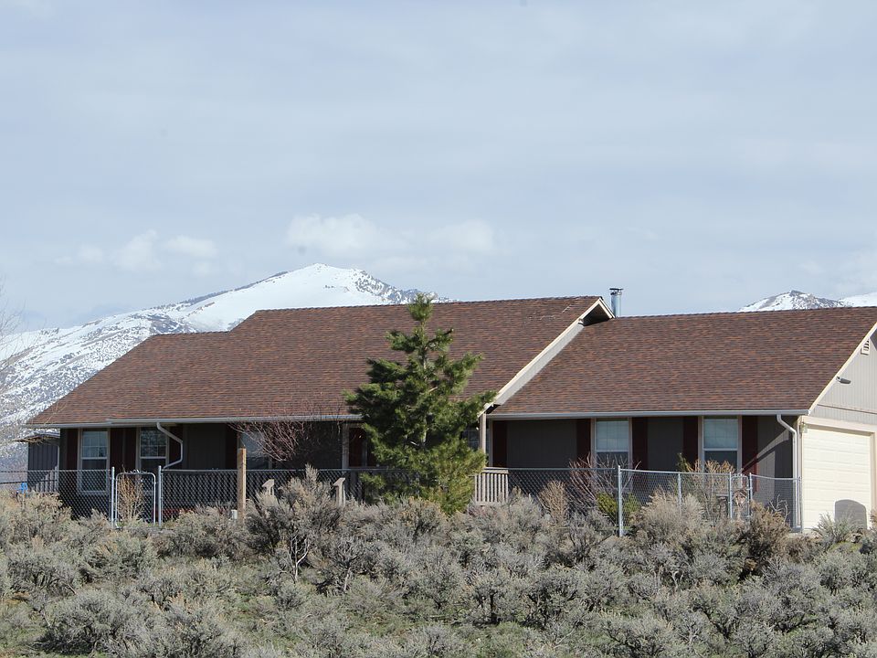 Open floor plan with wood stove in the living room. Great views of the Ruby Mountains