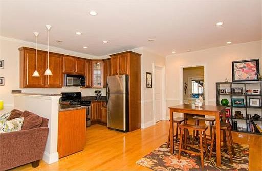 Prime East Side Location! Beautiful two-bedroom home with open floor plan features modern kitchen with stainless steel appliances and granite countertops, living room with gas fireplace, spacious dining area, large home office, updated baths, and central a/c. Master suite with sliding doors to private deck and private brick patio area for entertaining. Offers hardwood floors, high ceilings, and crown molding. Walking distance to Castle Island and Seaport District.