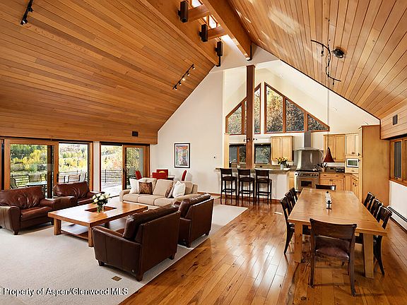 This beautiful, mountain contemporary home is located on a lovely one-acre private setting on Faraway Road in the heart of Snowmass Village. It takes advantage of fabulous, sweeping views to the east overlooking Two Creeks ski area and the Continental Divide as well as to the northwest with views of the village. Enjoy colorful sunrises/sunsets, sun filled days as well as star gazing at night from two, expansive outdoor deck living spaces of 2,600 square feet of Trex decks. The home has been meticulously maintained with multiple updates to both interior spaces as well as a total exterior renovation in 2014 giving it a fresh, modern look. An open floor plan creates large living spaces, which is ideal for families and friends to entertain large gatherings or host casual, intimate gettogethers. Three separate living spaces include a large family room, office/study and separate media room, each generous in size. There are five spacious bedrooms plus a bonus bunk room and six full bathrooms that can easily sleep twelve people. Amenities include wood/gas fireplace in the living room, deluxe outdoor hot tub/spa, generous storage rooms, large laundry room and attached, heated two car garage. This custom-built home also has a successful rental history earning high praise from guests. Enjoy the beauty and serenity of the mountains in the comfort of your own home. togethers. Three separate living spaces include a large family room, office/study and separate media room, each generous in size. There are five spacious bedrooms plus a bonus bunk room and six full bathrooms that can easily sleep twelve people. Amenities include wood/gas fireplace in the living room, deluxe outdoor hot tub/spa, generous storage rooms, large laundry room and attached, heated two car garage. This custom-built home also has a successful rental history earning high praise from guests. Enjoy the beauty and serenity of the mountains in the comfort of your own home.