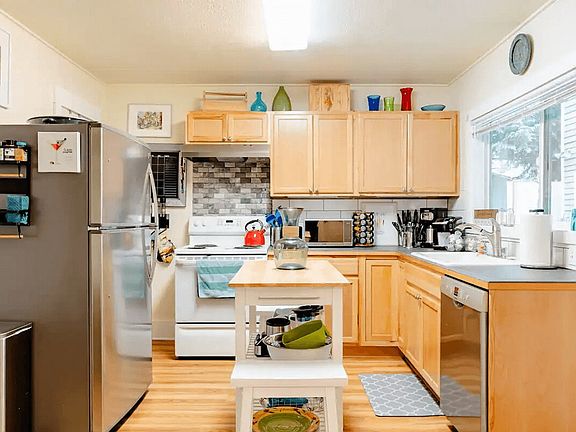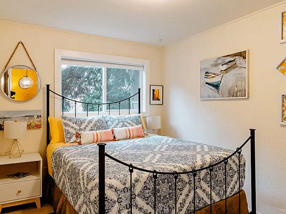 Enjoy a stylish experience at this centrally located duplex on the 1st floor. Close to Starbucks and restaurants, and just blocks away from the popular Greenlake Park, everything you need is close by. This apartment features 1 queen bed and 1 daybed that can turn into a king-size bed, a full-size kitchen, in-unit washer and dryer, and on-site parking space in the alley. Situated on a great street of single-family homes, you'll feel right at home as soon as you open the door, with beautiful natural light spilling into the living room during the day. Your fashionable, single-floor unit is incredibly cozy, and you'll feel right at home as soon as you open the door. Beautiful natural light spills into the living room during the day, enhancing the cozy atmosphere. On-site parking is available in the alley for your convenience. The location is amazing, ideally situated in a calm residential area yet close to everything. Not even half a mile to Green Lake Park and its Bathhouse Community Theater, and a 5-minute walk to the beloved Beth's Cafe or PCC Community Market. Situated between Greenlake, Greenwood, and Phinney Ridge, and close to Wallingford, Fremont, and the University District, you're near several of the most interesting neighborhoods in North Seattle. With a walk score of 91, your location is extremely walkable, with all kinds of cool spots and sights right around the corner. The Greenwood commercial area, a village unto itself, is about a 15-minute walk to the west, offering cafes, coffee shops, a grocery store, pubs, churches, and a post office. Greenlake is about a 10-minute walk to the east, featuring a 3-mile walking/jogging trail around a lake, popular restaurants, cafes, and coffee shops, as well as pickleball courts, canoes, and golf. Woodland Park and Zoo is less than a five-minute drive south on Aurora or along Greenwood Ave, known for its series of open-air summertime concerts. Lower Woodland has areas that can be reserved for BBQ and picnics. Seattle Center and Central Business District is about a 15-minute drive south on Aurora Ave, with the Seattle waterfront and Pike Market an additional ten minutes away. For visiting medical professionals, three major hospitals are a 5-18 minute drive away. The air conditioning is a window unit, and since the apartment is on the ground floor out of direct sunlight, it does not usually get too hot. There is a $250 smoke remediation fee for evidence of smoking indoors and a $250 fee for breaking the no pets rule. Your unit is the bottom floor of this duplex home. The entrance is at the back of the building, near the parking lot on the left side, close to the neighbor's shed. Look for the bistro tables and the newly painted teal door to find your entrance.
