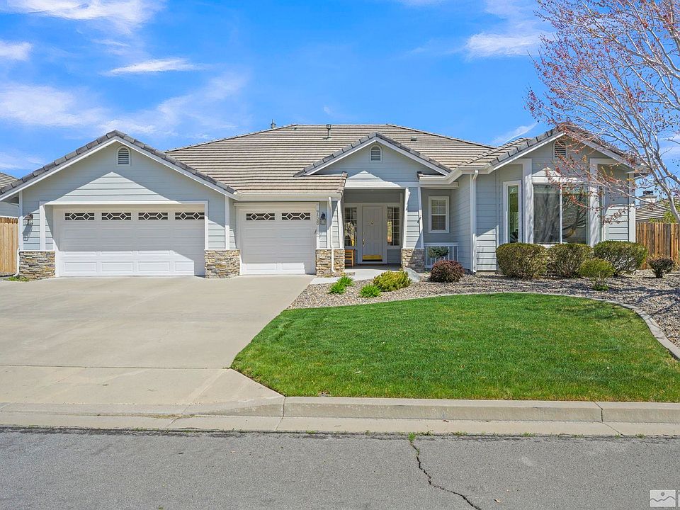 This 2,543 sq. ft., 3 bedroom plus an office, 2.5 bath, 3 car garage home is a favorite plan in the very popular Kings Canyon Highlands! There are walking paths all around and behind the homes which really create great privacy. Behind the house is a path and open space with no behind neighbors. This property has been meticulously cared for and updated through the years., The office could easily be converted to a 4th bedroom with the addition of a closet. There is a wall of windows in the living room/dining room combination and a gas log fireplace. The kitchen and family room are light and bright as well. The kitchen has been updated with newer appliances and beautiful granite counters. The kitchen offers a breakfast bar and nook and is open to the family room. There is access to the backyard from the living room/dining room as well as the kitchen/family room. The landscape is beautiful with a low maintenance backyard with two retractable awnings, a large paver patio and dog run. The home and backyard is very private with open space and a walking path behind the home. This property is up Kings Canyon, being close to Carson City downtown with its restaurants, shops, outdoor concerts and other happenings. It is also close to the mountains for hiking, bike riding, walking, snowshoeing and other outdoor activities.