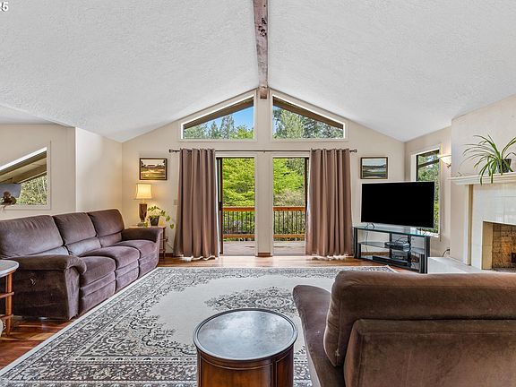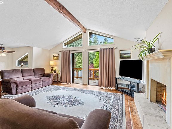 Tucked into a peaceful cul-de-sac and backing to lush City of Gresham forest space, this 3-bedroom, 3-bathroom home offers the perfect blend of comfort, space, and serenity. Situated on nearly a quarter acre, the property provides both privacy and room to grow.Natural light pours in through skylights and large windows, highlighting the open floor plan and vaulted ceilings throughout the main living areas. The living room features an exposed beams and a cozy fireplace, creating an inviting and spacious environment for everyday living or entertaining.The updated kitchen is beautifully appointed with white oak cabinetry, a large island with bar seating, and seamless flow into a vaulted bonus room with built-in bar and cabinetry. French doors lead out to a newer deck, extending the entertaining space outdoors.The primary suite offers a peaceful retreat with vaulted ceilings and a built-in desk area that can serve as a work-from-home station or vanity. A downstairs family room with a second fireplace adds additional living space, perfect for gatherings or cozy nights in.The dining room opens through French doors to a patio, and multiple newer decks create an ideal setup for enjoying the beautifully landscaped backyard—complete with water features and a putting green.Additional highlights include newer flooring throughout the main areas, a two-car garage, and an extra half-size third garage/storage space. Located just minutes from Persimmons Golf Course, this home offers convenience with a quiet, natural backdrop.This home is filled with warmth, light, and potential—awaiting your personal touch and love to make it truly yours.