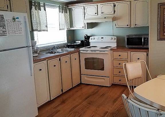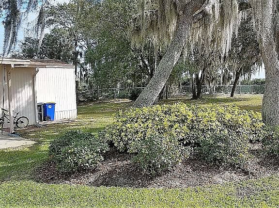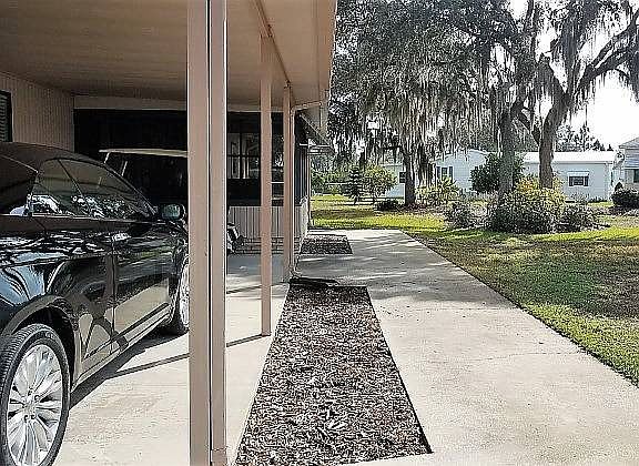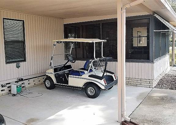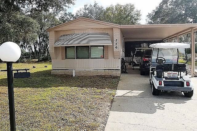 Lovely 2 BR 2 BA home on a great perimeter lot. This spotless home has wood laminate in kitchen, dining, and hallway. 14 X 10 addition on master bedroom with reading area and walk in closet. Florida room with glass windows, and new screen plus window AC unit. 1106 Under Air. Golf Cart Included With Full Price offer. Home is in a beautiful senior park with many amenities