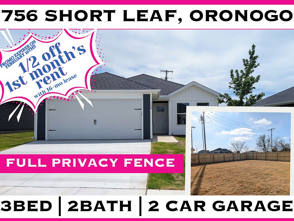 FULL PRIVACY FENCE Webb City schools!! Welcome to 756 Short Leaf, a brand-new rental property offering a comfortable and contemporary living experience. This immaculate pet friendly home boasts 3 bedrooms, 2 bathrooms, and an attached garage. The open-concept floor plan provides a sense of spaciousness, accentuated by modern amenities such as granite countertops and beautiful soft-close cabinets. Equipped with all necessary appliances, this home is designed to cater to your daily needs with ease. Each bedroom features ample storage space and large walk-in closets, ensuring that you have plenty of room to organize your belongings. Tenant responsible for: -Electric, Gas, Water/Trash -Yardwork Pets considered with -$250 non-refundable fee -$50 extra per month per animal Application: $35 per Adult for criminal background check, eviction search, credit check (score doesn't matter- looking for history of payments and debt to income ratio) Qualifications: -Must have 3 times monthly rent as income -No previous evictions -No smoking inside -$1549 rent and $1549 deposit due before move in prorated rents for mid month move in