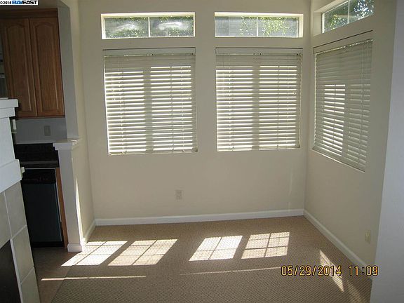 1st floor end unit, just steps away from club house & pool/tennis court. Remodeled kitchen & bathrooms, granite slab counter top, inside laundry, refrig/washer/dryer included. Dual-pane windows, alarm, A/C, private balcony & storage. 1 car detached garage + 1 parking. Near BART & Stoneridge.