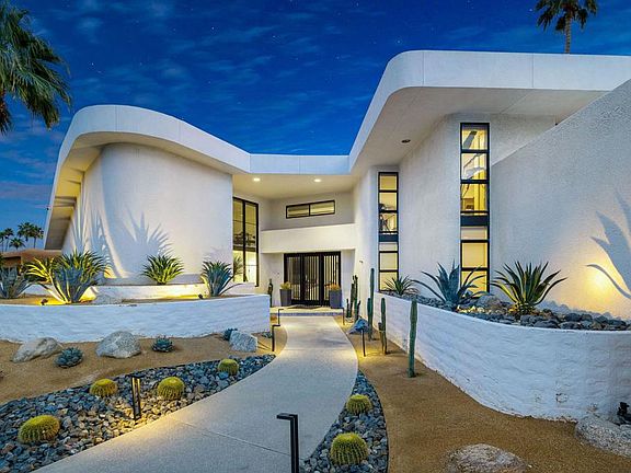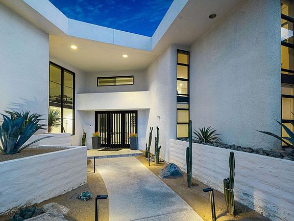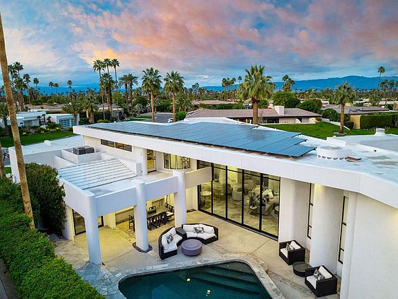 One of a kind opportunity to own In Indian Wells with stunning curb appeal and soaring ceiling height. Fully renovated, owned solar system, turnkey furnished, the home is in it's own class. Approach to a grand entry way with custom front doors opening into a huge view of Mount Eisenhower through the 15 ft tall, 25 ft wide multi slide doors. 17 ft. geometric wood ceilings soar over quartzite stone flooring and eco burner fireplace. Bar with ice maker and lounge seating are great for entertaining. The gourmet kitchen showcases new cabinetry, Jen Air appliances featuring built in refrigerator, beverage cooler, two dishwashers, range, and oven/speed oven combo. Prep sink and ice maker in island. Beyond the kitchen is a dining area with seating for eight. Going up stairs on the iron staircase, the loft has glass railings, entertainment area, and secluded office with mountain views. Primary suite offers vaulted ceilings, seating area and fireplace. Bathroom features stone shower with dual heads, soaking tub, dual vanities, custom mirrors, and large closet. Both guest suites are like primary suites. Large bedrooms and bathrooms with custom tiled showers. Bedroom 4 offers a sliding door and a large bathroom with shower. Backyard has geometric shaped pool with stone surround, large spa, built-in bbq, and fire pit. Garage with golf cart space, fully renovated with minisplit. Call today to set your appointment.