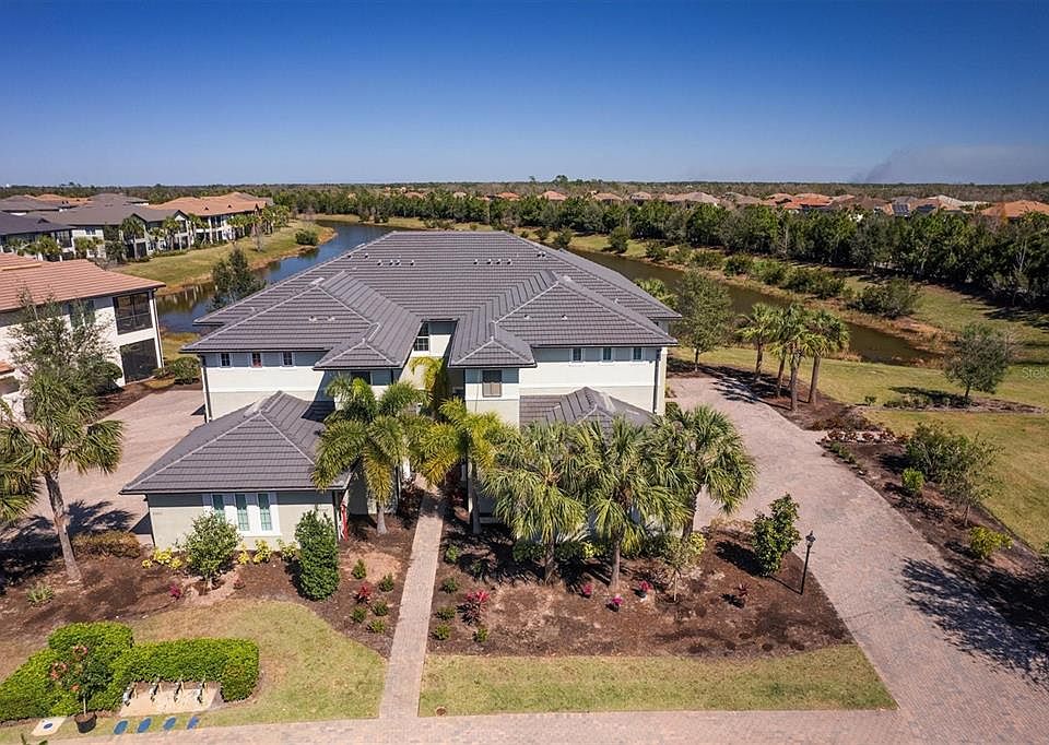 Welcome to Clubside at Country Club East in Lakewood Ranch where living is care free and luxurious! This exquisite FORMER MODEL home built by WCI offers 3 BR plus den, 2 BA, 2 car garage and is a second floor "Coach Home" equipped with an elevator making the trip up so convenient. Take in spectacular LAKE AND PRESERVE VIEWS from all main living areas and enjoy peace and quiet on your oversized covered lanai with no neighbors above you! This Montserrat model is a true split floor plan with the master at the back with water views and the secondary bedrooms up front. This home is stylish, modern and highly upgraded with designer coffered ceilings, wall panel design in the hallway, living and dining room with crown molding throughout the entire home. The flooring is designer tile through main living spaces including the master bedroom, upgraded wood flooring on the stairwell including upgraded wood railings with wrought iron, engineered hardwood floor in the double door entry den and carpet in guest bedrooms. The home has been meticulously cared for, barely lived in and offers a gourmet kitchen with granite counters, tile backsplash, under cabinet lighting, stainless steel appliances with gas range, large pantry closet, tons of cabinet space, breakfast bar with seating for three+ and connected to a breakfast nook for more seating. The luxury master suite offers comfortable space, privacy, access to the lanai, on suite bath with dual sinks, private water closet, large step in tile shower with high end glass door, linen closet and walk in closet with built in organizers. The secondary bedrooms are both spacious and share the guest bath. Many upgraded and designer touches including unique and spectacular lighting, window treatments, Sonos built-in speaker system, large laundry room with storage cabinets and sink, Descending to the 2 car garage you will find the tankless water heater (gas supplied), epoxy coated flooring, extra outlets and metal storage racks attached to ceiling. The driveway is extra wide and includes a paver pad to roll your grill out to. This home offers maintenance free, lock and leave living in a gated resort type community and includes 3 community pools and the clubhouse and fitness center at the Retreat which is close proximity to Clubside. There is optional membership in the Lakewood Ranch Golf and Country Club for social, sports and/or golf membership. Note - there is currently a waiting list for the golf membership. The beautiful furnishings are being offered as a separate sale transaction and have been selected to coordinate perfectly with all the colors, accents and window treatments. Country Club East offers a convenient location to Lakewood Ranch Main Street, the UTC shopping and dining mecca, about 30 minutes to downtown Sarasota for cultural events and approx. 40-45 min to Lido Beach or Siesta Key. See this home today!