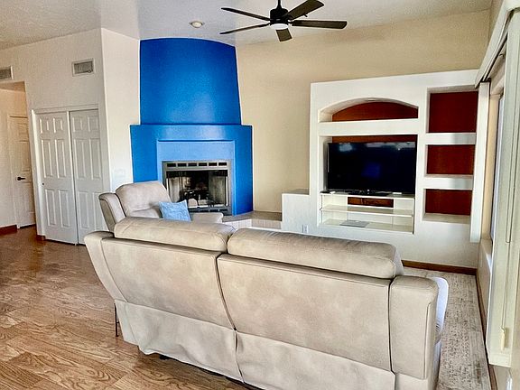 A gas pueblo fireplace adds a touch of coziness in winter. The spacious kitchen can hold many cooks, and the Traeger grill on the patio is large enough to cook a turkey for a holiday party.