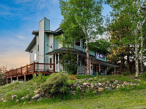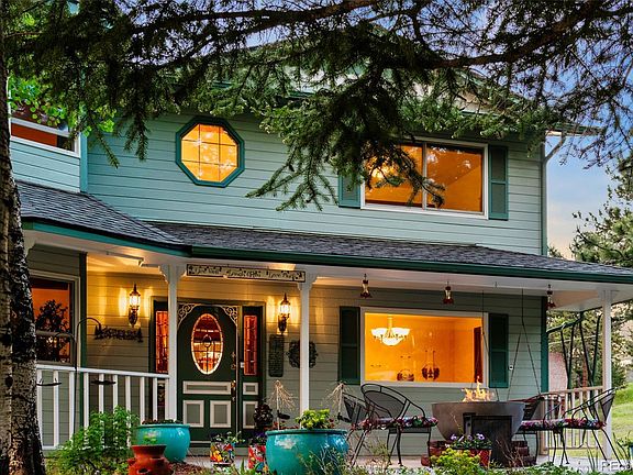 Nestled on over an acre of meticulously fire-mitigated property in a tranquil small Evergreen neighborhood, this charming 3-bedroom, 3-bathroom home offers the perfect blend of luxury, comfort, and natural beauty, with frequent wildlife sightings adding to its serene ambiance. Step inside to find a spacious living area featuring a stunning wood fireplace surround imported from England and beautiful red oak hardwood floors. Discover culinary elegance in this stunning kitchen, featuring rich cherry cabinets and newer high-end appliances. Enjoy the gas range, double oven with griddle, and sleek silestone quartz countertops. Australian cypress floors add charm, while the breakfast bar offers a cozy spot for casual dining. A dedicated wine fridge completes this chef's dream space. Off the living room is a two story sunroom with floor to ceiling windows your plants will love; this would also be a great spot for yoga or an art studio. The home boasts wrap-around decks, ideal for enjoying the breathtaking mountain views and outdoor entertaining. A dedicated office space provides a quiet environment for work or study, while the recently remodeled primary suite offers a private oasis with modern amenities. The new Anderson windows throughout the home ensure energy efficiency and uninterrupted views of the surrounding landscape. Outside, you'll find flower beds in full bloom, a cozy fire pit for evening gatherings, and a circle driveway for convenient access. The property includes an oversize garage and two large sheds, providing ample storage for all your needs. High speed Xfinity internet connected. North Turkey Creek Park is in the subdivision and Flying J Ranch and Meyer's Ranch are close by for outdoor adventures. This location between the charming towns of Evergreen and Conifer provides abounding amenities; restaurants, shopping, pubs, wineries, and grocery stores allowing you to live in the peaceful surroundings of the Colorado mountains without a worry to be had.