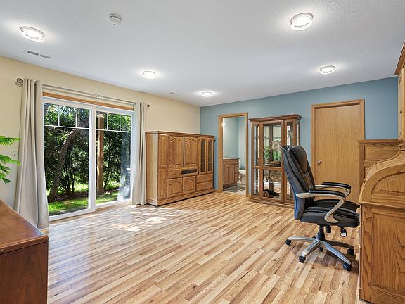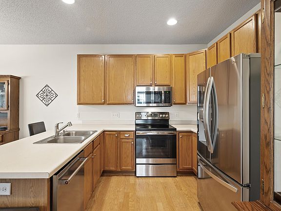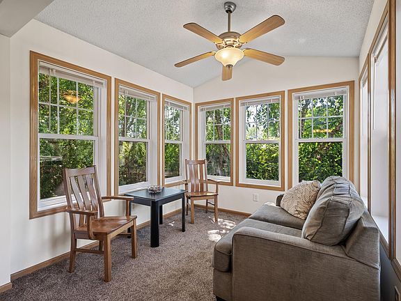 Welcome to this spacious, move-in ready home featuring 1-level living on the main floor. This end unit townhome has added value from natural light on 3 sides of the dwelling; and a unique sun room with filtered light from the surrounding trees in the backyard. You'll find a living room, kitchen, sunroom, bedroom, bathroom, and laundry facilities all on the spacious main level, which has 9-foot ceilings. The living room features a gas-burning fireplace with stone surround. Newer stainless steel appliances in the kitchen, and washer & dryer set. Priced fairly at the tax assessed value of the home, this spacious home is about 500 square feet larger than the average 3 bed, 3 bath townhome in this area. The upper level hosts two bedrooms: a large primary bedroom (14'2x13'9) with a full walk through bathroom, walk-in closet and a vaulted ceiling. This bathroom has a separate tub and shower, and a brand new vanity top. Nestled in the trees, the view faces west for glorious sunsets, with glimpses of spacious farmland in the distance. Recently finished walkout lower level provides versatile additional living space with natural light from the glass patio doors. There is a new 3/4 bathroom with a heated ceramic tile floor and an oak vanity with a granite countertop. The utility room features a new utility sink with an oak cabinet. You'll appreciate the many newer upgrades in this home, including the plush padded carpet and fresh interior paint: New Roof ('23), Air Conditioning ('23), Utility Sink ('22), Finished Lower Level Family Room & New 3/4 Bathroom ('22) Water Heater ('18), Kitchen Appliances & Washer/Dryer ('19). There is ample green space across the street; and a nicely landscaped walking path through the neighborhood that encircles a park with a playground and nearby tennis courts. This beautiful home is perfect for anyone looking for a comfortable, affordable, stylish and spacious place to live.
