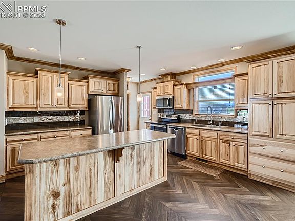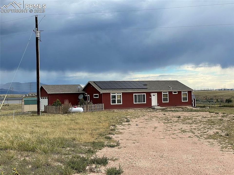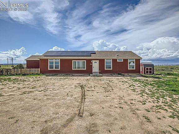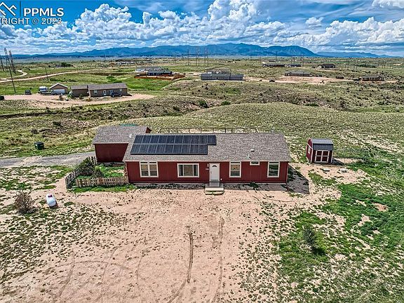 Beautifully maintained one level ranch IRC Modular home situated on 3.7 acres with the west and north property lines backing to a large no build easement with sweeping mountain views*Active Solar covers ALL Cost for electric & Central Air*Nine foot ceilings w/ crown molding & paneled doors throughout*Coffered ceilings in living room & family rooms adds to the architectural appeal*Gourmet island kitchen has raised panel natural hickory cabinets w/ crown molding & soft-close doors, stainless steel appliances including a French door refrigerator, custom glass backsplash and 2 pantries opens to the walkout family room with a cultured stone faced gas log fireplace*Private owners retreat with a walk-in closet w/ adjoining 5 piece bath with subway tile and soaking tub*Fenced dog run, 10x12 lofted barn, 10x12 shed, 22x22 attached garage level to the house, w/ 8 foot door and opener, Brand New Carpet and Pad*Water Softener with reverse osmosis Tap located at kitchen sink, No "Hard" water, No HOA, County maintained roads, just down from the Elementary School & Fire Department*Zoned for Horses & Chickens*Located 22 minutes or so to Pueblo or Colorado Springs, 20-25 minute commute to Fort Carson*Move-in-ready!