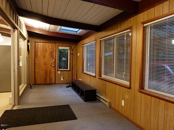 This 1960's contemporary home is on a large, treed lot with community beach access just down the street. Main living on street level with additional finished living space downstairs...great for extended family caregiver, hobbies, crafts, etc. Vinyl windows, new interior paint & some new flooring. Membrane roof, two fireplaces, circular driveway, & oversized single garage with service pit, & drive-thru carport. Short distance to Newport, NOAA, Hatfield Marine Science Center, & the airport. A classic beach house in the quiet neighborhood of Surfland!
