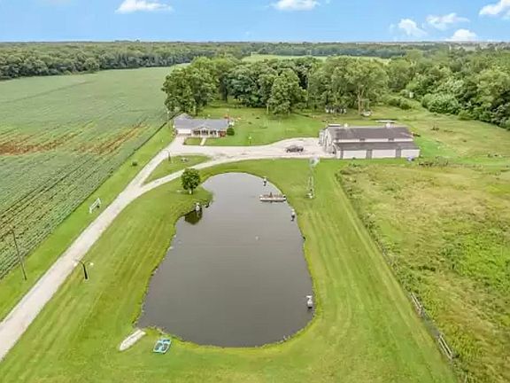Single family home, 3 BR, 2 Bath with a large recreation room that can be converted back into 2 additional bedrooms if additional rooms are needed. Home sets on 13.67 acres with 4 acres wooded, pole barn 80 x 100 ideal for horses, and additional storage garage detached. Also outdoor patio to view wildlife in the woods. Great community and schools, low taxes, safe neighborhood. Large stocked pond great for the fisherman in the family. Low taxes, house has new shingles, new AC unit, new furnace.