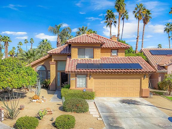 Welcome to your dream home on Easy Street! With No HOA fees this beautifully remodeled 4-bedroom, 3-bathroom pool home is ideally located in the heart of Palm Desert. The open-concept floor plan boasts an abundance of natural light with large windows and skylights throughout, creating a bright and inviting atmosphere. The family room flows seamlessly into the kitchen, complete with a stunning stacked stone fireplace, perfect for cozy gatherings. There is a separate, spacious great room and formal dining area as well. The home has been thoughtfully upgraded, including a fully renovated kitchen, bathrooms, and new flooring, lighting, heating, and AC systems. The interior has been freshly painted, and the garage features new epoxy flooring and new garage door opener. This home is designed for both comfort and entertainment and the poolside patio is perfect for al fresco dining or relax in the elevated pool cabana area, your own private oasis. The expansive master suite includes a fireplace, a large walk-in closet, a soaking tub, a shower, double sinks, and a private balcony overlooking the sparkling pool. Upstairs, you'll find two additional bedrooms, while the fourth bedroom is conveniently located downstairs. The backyard is a true retreat, featuring a recently updated saltwater PebbleTec pool and spa, complete with an updated saltwater filtration system, heater, and pumps. Each bedroom is equipped with a ceiling fan for added comfort. Additional upgrades include new cabinets, tile, laminate wood flooring, lighting fixtures, faucets, and toilets. Energy efficiency is key with a new water heater and owned solar panels under the NEM 2.0 plan, helping keep utility costs low. The low-maintenance desert landscaping out front adds to the home's appeal, and the security system ensures peace of mind. This home truly has it all--don't miss out on this exceptional opportunity!