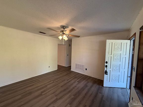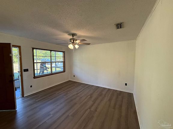 2.1-acre homestead with a 3/2 home. BRAND NEW LVP FLOORING THROUGHOUT. Garage and patio floors refinished. Approximately 2/3 of the land has been cleared. The lot sits high and dry with no wetlands and is in Flood Zone X. The Land is zoned as Medium Density Residential and is secluded with neighbors only on each side. The land could be a development opportunity due to zoning. The house is on a slab with great bones. Recently serviced AC, copper wiring, fully functional plumbing system with newer attic insulation. It would make a great starter home for someone handy. Numerous options for potential buyers. The seller is motivated and is open to making some concessions. Hurricane shutters for all windows convey ($3-5K Value). Tax assessed value of $233k. One of only a few multi-acre homes listed in Escambia.
