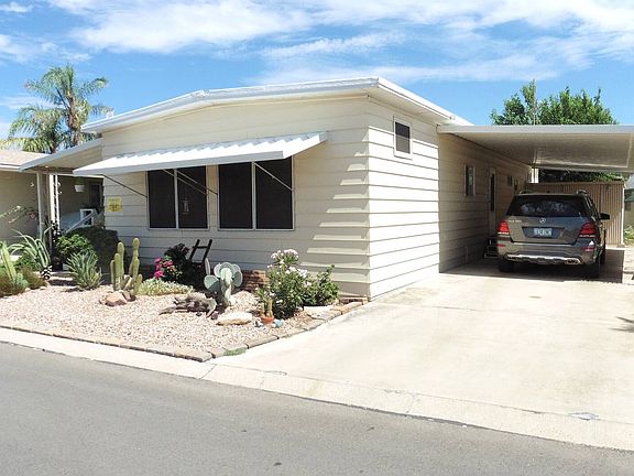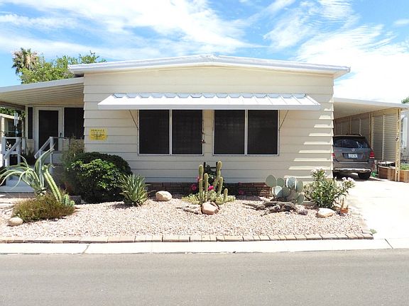 WELL-MAINTAINED COZY AND COMFORTABLE HOME WITH NICE FLOORPLAN! Including the large Arizona room, there's over 1,400 square feet of living space. The large front living room has many windows for light and viewing. The dining area has a built-in double hutch for lots of extra storage. There's beautiful laminate flooring in the living areas and carpeting in the two bedrooms. The master bedroom is king-sized with an ensuite bathroom and separate dressing area with walk-in closet. The huge 400 square foot Arizona room could easily be split into two entirely separate rooms. The washer and dryer are currently hooked up in the 100-square-foot workshop but if you prefer, you can move them into the home where there are hookups as well. The insulated lap siding, insulated skirting and long-lasting foam/metal roof provide great energy efficiency. The rear and patio side of the home is a gardener's delight with beautiful landscaping and in-ground sprinkler system. Far Horizons East is one of the finest luxury gated adult communities in the Tucson area. It has a huge socially-active clubhouse with his and her saunas, a heated pool, spa, exercise room, billiards room, library, putting green and much more. There is also a second pool for the serious swimmers. The park has 24/7 security and an RV parking facility. Pets are not permitted, however, check with park management regarding service animals. Far Horizons East is located on the near east side close to much shopping, transportation, entertainment, restaurants, hospitals and the Pantano River Walk.