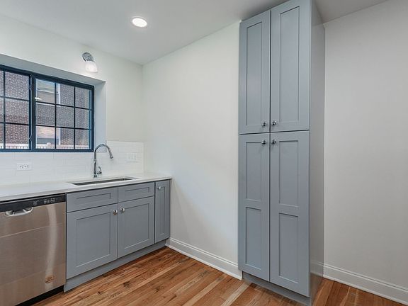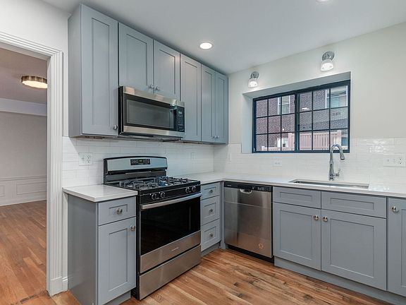 High end kitchen with all new light grey custom cabinets, stainless steel appliances and quartz counters.