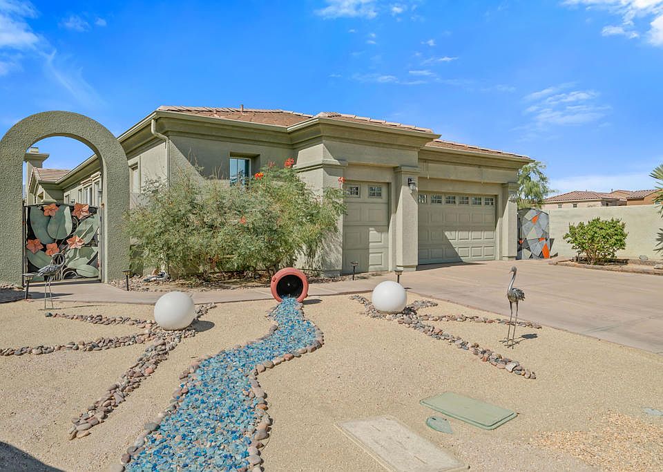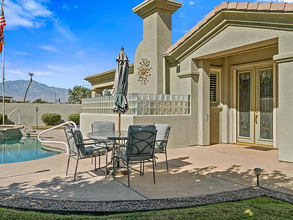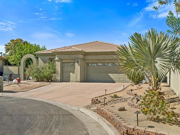 Welcome to Avondale Golf Club (AGC). This three-bedroom, three-bathroom pool home boasts 2,516 SF of living space and is located on a large 13,000 SF lot on a cul-de-sac. The double door entrance welcomes you into the open living and dining areas with a wet bar. Adjacent to the dining area is the kitchen featuring slab granite counter tops, center island and an abundance of cabinet space. The spacious primary bedroom has an en suite bathroom with shower, soaking tub, and slab granite counter tops. The large walk-in closet provides plenty of space for clothing and storage. Doors off the primary bedroom lead out the private yard featuring a pebble tech pool, spa and westerly mountain views. The large second bedroom overlooks the courtyard and is conveniently located across the hall from the second bathroom. The third bedroom, an attached casita has private entrance and features an en suite bathroom. Outdoor living features of the property include a covered patio with ceiling fans, built-in gas BBQ and a motorized retractable awning. Imperial Irrigation District (IID) provides the power which is less costly than other power providers. This property is on the only street within AGC that is on sewer. HOA includes social membership, cable TV, WiFi, Dog park, fitness center and pickle ball courts. AGC is conventionally located to Interstate 10, shopping, entertainment, colleges and is a short drive to Palm Springs International Airport.