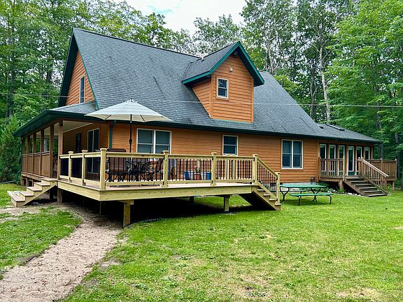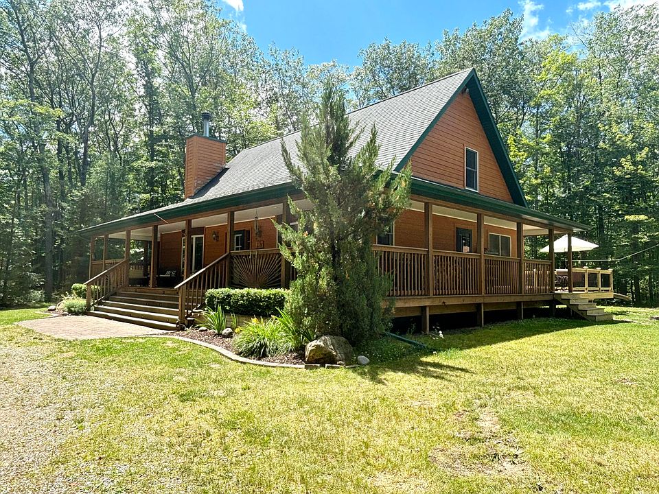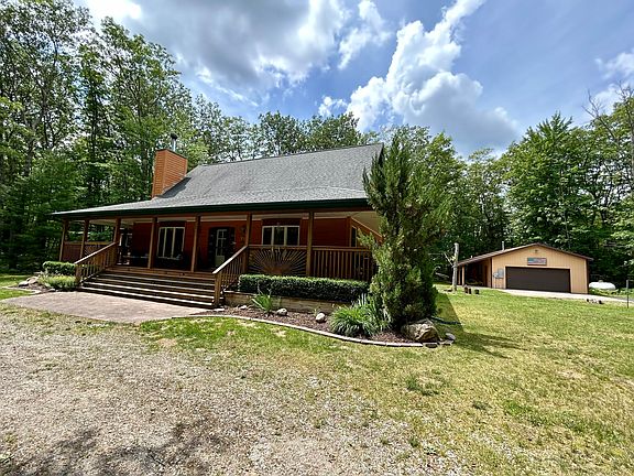 Wow! Come check out this recently updated 4 bed 2 bath home with over 3400 sqft of living space! It sits on 5 beautiful hardwood acres with groomed trails throughout and is just a short distance from the Au Sable River, Forest Dunes Golf Course, and miles of ORV trails. The outside of the home has a large wrap around porch that leads to a brand new 16x16 deck with Timbertech composite decking. Over 30 trees were taken down to allow for an ample amount of natural light to enter the home throughout the day. Inside the 24x40 garage, is space to park two vehicles, as well as an additional living quarters that includes a full bathroom, kitchenette, and bedroom with a forced air furnace. On the inside you will find a brand new kitchen with granite counter tops and stainless steel appliances. Further updates include all new laminate flooring on the main floor and carpet throughout the upstairs. To top it all off, is the gorgeous 20x20 sunroom lined with windows on three sides and 4 skylights in the ceiling. It offers a large hot tub for year round fun.