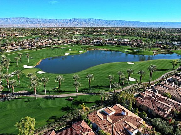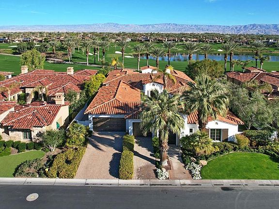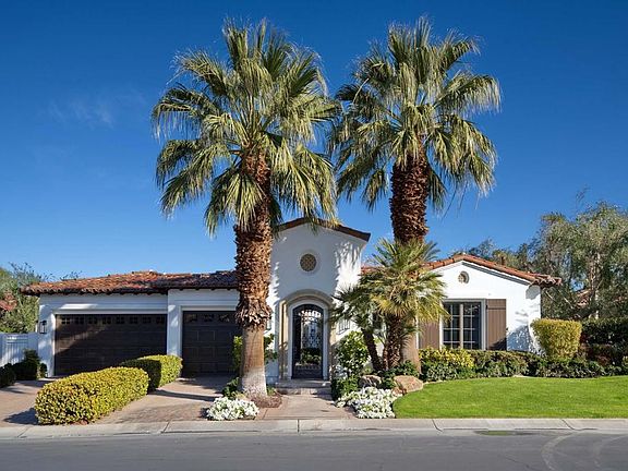 This gorgeous 721 Plan home situated on an oversized homesite in Toscana County Club offers the epitome of desert living with picturesque views of the Jack Nicklaus Signature Golf Course. Stunning upgrades include new exterior lighting, new carpet in the bedrooms and guest house installed in 2020, Hunter Douglas shades throughout the home and guest house, extra-large fenced-in backyard, artificial turf with putting green, cabinets with slatwall in garage, and more.The great room's upgraded pocketing slider doors allow for indoor-outdoor living, with the whole-house sound system also wired for the covered veranda. Wood-beamed ceilings and stone-wrapped fireplace mixed with modern chandeliers give this home its classic contemporary feel. The gourmet kitchen features honed Taj Mahal quartzite countertops that match the wetbar; plenty of prep space with the island and breakfast bar; and newer range hood, backsplash, sink, faucets, and Fisher Paykel dishwasher.The master bedroom is a spacious retreat featuring double cornered-glass window and sliders to one of the covered verandas, and a palatial bath with soaking tub, His & Hers separate vanities, and walk-in shower. The massive outdoor space showcases the custom pool, spa, built-in grill, and putting green all offering unlimited entertainment opportunities. Guests can retire to either of the main-home guest rooms with en-suites, or the private guest house with living room and kitchenette.