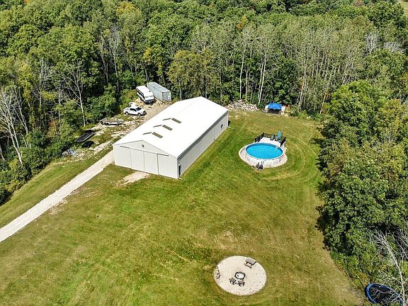 Sportsman's retreat on 8.59 private acres with wooded trails, a walk-out lower level, and hunt-from-your-backyard convenience. The HUGE 42'x80' pole barn delivers a heated, spray-foam-insulated workshop plus massive storage for UTVs, boats, RVs, and all your gear. The attached GA even offers an EV charging outlet. After a day outside, warm up by the wood-burning fireplace, cool off in the pool, or unwind on one of two patios or at the fire pit. Nearly $300K in updates: new roof & gutters (2025), central air (2024), siding (2020), a Culligan system with iron filter (2024), newer appliances, and MORE! With 5 BRs, 3 full BA and a partially finished Lower-level, you'll have over 3000 square feet of space for your whole family. Quiet setting, room to roam, this is your year-round base camp.