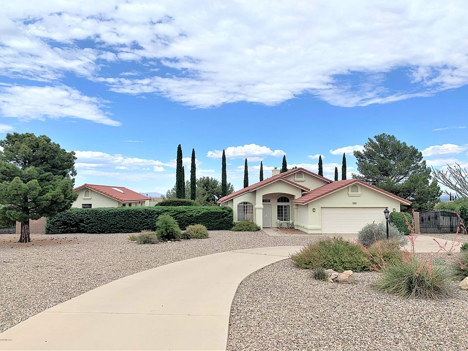 Relax in your own private walled retreat with mountain views including nearby Miller Peak.The 1.19 acre corner lot is surrounded with mature landscaping including numerous pine,shade & fruit trees + several patio and sitting areas to enjoy it all.The 4 bdrm 2 bath home has a family room featuring a wood burning fireplace that is open to the kitchen with an island & breakfast nook & a separate formal living room with dining area. The 4th bedroom is currently used as an office/den. Added bonus is a detached 500 sq ft studio / man cave w/sink and a/c.The lot has 2 RV gates w/ RV parking in the side yards.The Miller Canyon location & the ability to walk, jog or ride your bike to the beautiful nearby Miller Canyon trails just adds to this lovely property. Shown by appointment only. Masks req.