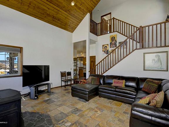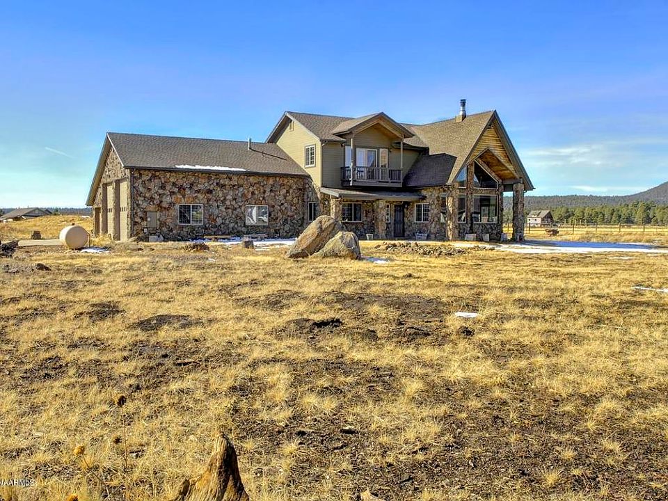 Now available, a custom home that is perfectly located to take advantage of the views of the San Francisco Peaks. This home is situated on 2.49 acres, at the end of the road, which offers both privacy and a peaceful setting. Native stone work accents the exterior and Turkish travertine tile inside, makes this home unique. The floorplan gives you two en-suite bedroom/bathrooms upstairs, one bedroom and half-bath downstairs, plus an office in the extra large garage. The garage provides space for 4-plus cars &/or RV parking. There are 3 doors; 2 are 12.5-ft tall door, 1-8-ft, plus a walk-through door that provides access to the back yard. Don't overlook the private office located on the South side of the garage. All of this space is Heated by the in-floor radiant system. Each floor &