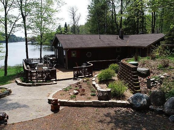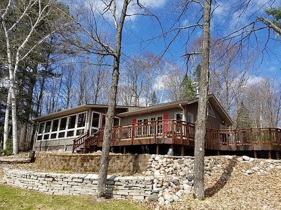Long Lake - Quality Home with Awesome View! 2+ BR, mostly furnished, yr round home has gorgeous lakeside glass sun room w/breath-taking view & leads to large wrap around deck. Large family room w/fantastic lake views & freestanding stove; living room w/field stone fireplace, custom kitchen w/hickory cabinets, granite counter tops, matching center island, appliances, Bosch dishwasher. 2 bedrooms, 2 baths, the main w/custom built walk-in glass/stone shower, corner vanity & heated floor. Plus Basement w/washer, dryer, work bench, huge storage room, Central air, LP gas forced air heat, drill well, conventional septic, The large wrap around deck has plenty of room for entertaining, relaxing and enjoying the stunning landscaping with stamped concrete walk way. Garage w/workbench & attached lakeside bunk room w potential kitchenette, shower & vanity for additional guests. 210 ft level shoreline on Long Lake, 4.79 acres land & custom cast iron entry gate with north woods flair.