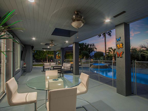 Highly Upgraded & Modern 4 Bedroom Pool Home In The Heart Of Palm Desert. Located in the highly desirable Sunterrace community, this solar powered home is designed to perfection! With an open floor plan & large lot, this property with casita is a perfect entertaining home with a resort like setting & lots of privacy. The kitchen features natural wood and shiny white cabinetry and a center island with waterfall edges. Living room with dramatic fireplace wall has a flush 85' TV and amazing speaker system through out. Great separation of rooms with large master suite on one side & two additional guest bedrooms & bath at other end. Casita is off of gated front courtyard. The outdoor living space is incredible. The sparkling pool and spa can be controlled from your phone or tablet. Fire pit is a great place to watch sunsets. The extended covered patio with wood ceilings provides a wonderful place to catch some shade. Outdoor kitchen features a BBQ, sink and fridge. Additionally, this pie shaped lot is wide with large grassy area with citrus at west end and plenty of decking at east side. Finished three car garage with epoxy floors. Inside laundry with tons of amenities. Turn key furniture & art available outside of escrow. Sunterrace is a private gated community with low HOA dues & a prime centralized location that is close to everything that Palm Desert, Indian Wells and La Quinta have to offer.