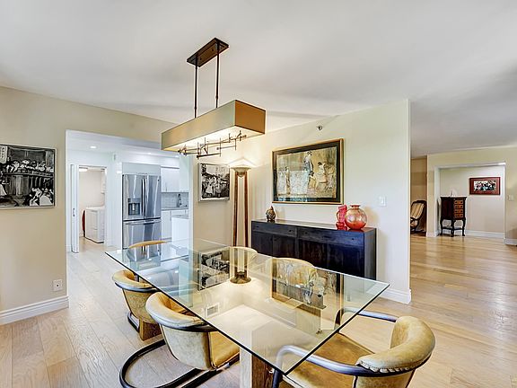 Don't miss the opportunity to own this stunning, move-in ready corner condo that lives like a private home. Completely renovated with meticulous attention to detail, this spacious residence has an expansive wraparound balcony with a gorgeous view of the golf course. Warm wood flooring flows throughout, complementing a host of luxury upgrades. The contemporary chef's kitchen is a true showstopper, featuring quartzite countertops, a double oven range, ample storage with easy-access drawers, a large walk-in pantry with shelving, and a built-in workstation overlooking the greens. The primary suite offers a spa-like bathroom with generous storage, an oversized shower, a high-end toilet, along with a massive walk-in closet outfitted with custom shelving. Secondary bathrooms have been beautifully updated, with elegant finishes and hand-painted walls. Originally a 3- bedroom, one bedroom was converted into a formal dining space but can easily be reverted. The thoughtfully designed laundry room includes custom cabinetry, a sink, broom closet, and second refrigerator. Additional highlights include impact windows, smooth flat ceilings, and custom window treatments. Regency is a boutique building with only two units per floor and fantastic, peaceful pool area. AC 2024/smooth ceilings If you are seeking an active lifestyle, join Boca Pointe's exclusive club and enjoy golf, dining and social events. Centrally located in Boca close to restaurants, shopping and highways. This rare gem combines luxury, function, and unbeatable views!