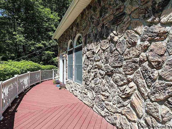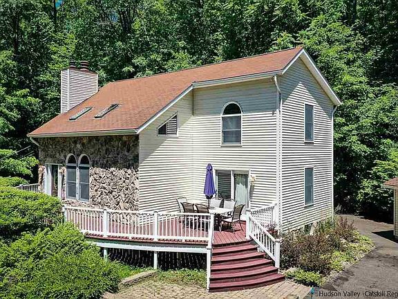Perched above Sawkill Road in Kingston NY, this stunning contemporary home is sure to amaze. The moment you step through the front door and into the living room you are greeted by cathedral ceilings, a magnificent stone fireplace and Mahogany wood floors. With an open floor plan, the living room, dining room, and kitchen all flow into a perfect entertainment symphony. Situated towards the back of the house sits the immaculate Kitchen overlooking the private wooded backyard. Sure to impress, finished with all custom Cherry wood cabinets, granite countertops, stainless steel appliances, and a huge island. Also occupying the first floor is a bedroom with its very own en-suite bath showcasing custom tile work and a walk out to the deck. Perfect for guests or one level living. Head upstairs to the loft space for views of the living room below. This has potential to be converted into the third bedroom or kept as a den/family room. The main bedroom is just a short distance down the hall richly appointed with crown molding, hardwood floors, and unique windows offering an abundance of natural light. There is also a large closet and its very own private bathroom. In addition, the home offers a full basement with concrete floors and both interior and exterior access. Potential for a game room, gym, or simply extra storage. Adjacent to state land with a stamped concrete patio, wrap around trex deck, and a detached one car garage…this home has it all. The best of both worlds just a short distance to Woodstock and 10 minutes to Uptown Kingston. *Sellers will offer a credit to the buyer to convert the loft into the third bedroom, or deliver it as a three bedroom prior to closing.