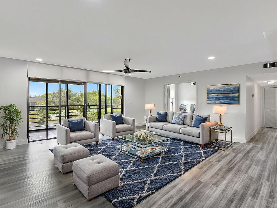 Luxury Condo with Modern Elegance and Breathtaking Sunset Views. Discover the epitome of refined living in this stunningly renovated condo located in the prestigious Boca Pointe Country Club. With a versatile layout featuring 2 bedrooms and a spacious office/den/flex room, this home is designed for both comfort and functionality, perfect for work, relaxation, or hosting guests. Every detail of this condo has been thoughtfully curated to create a contemporary and inviting atmosphere. Key features include: Modern Flooring: Sleek, luxury vinyl floors flow seamlessly throughout the unit, exuding style and durability. Gourmet Kitchen: A chef's dream with modern cabinetry, quartz countertops, and brand new state-of-the-art GE Profile appliances, ideal for cooking and entertaining. Updated Bathrooms: All 2.5 bathrooms have been impeccably updated with new vanities, elegant tile, and premium finishes. Enhanced Lighting: All-new light fixtures, fans, and custom blinds, with additional high hats added to the kitchen and living areas for an abundance of light. Ample Storage: Custom closets throughout, including a very spacious walk-in closet in the primary bedroom and an oversized storage closet for maximum organization. Convenience: Enjoy the efficiency of a brand-new, full-size Maytag washer and dryer. Step outside to two private balconies, one of which faces west, offering panoramic sunset views that provide the perfect ending to each day.