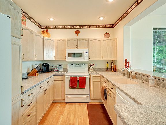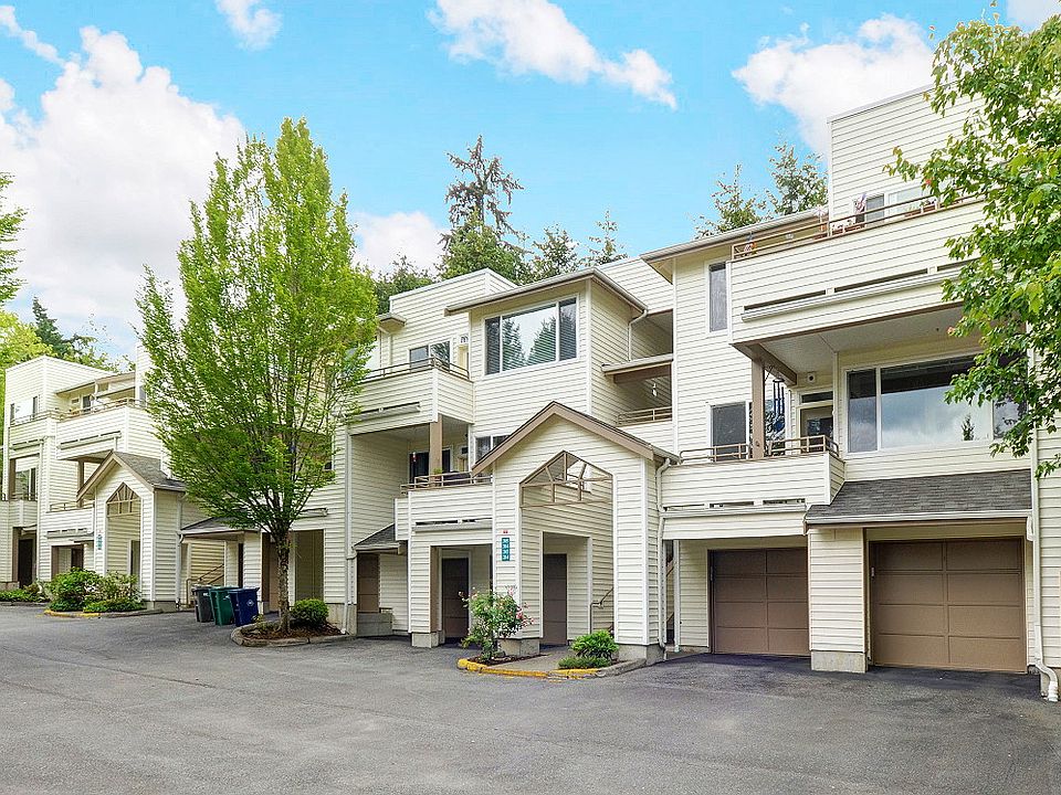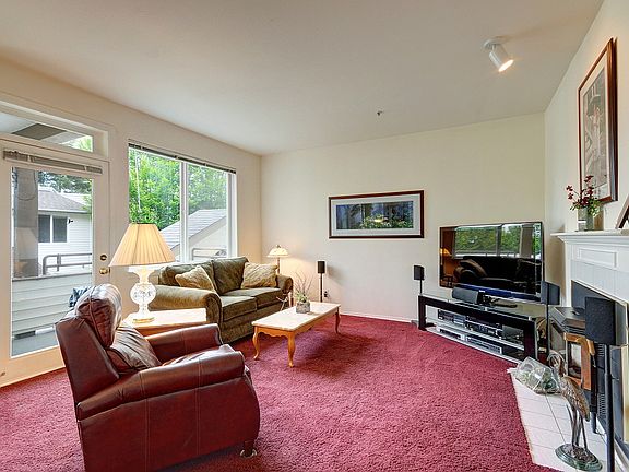 Impeccable 2 bedroom + den open floor plan condo in central Redmond. Completely remodeled bathrooms with tile, granite and heated floors. Large master with walk-in closet and en suite bath. Large deck. Kitchen has solid surface Corian counters and is open to the dining room and large living room. Pellet stove offers ample heat throughout the home. In spotless condition. 2-car tandem individual garage with extra room for storage. Well run HOA and building with no rental cap.