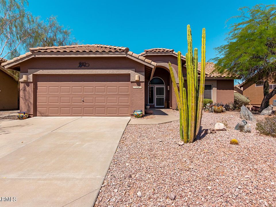 Check out this charming single-story property with mature landscape in Mountainbrook ! Discover the spacious living room with vaulted ceilings, warm palette, French door to the patio, window blinds, & ceiling fans. The Interior just recently PAINTED. The eat-in kitchen features essential appliances, granite counters, ample wood cabinetry with VIEWS of the SuperMountains, and an interior laundry room. This beauty also features a den great for an office, indoor laundry, and 2 cozy bedrooms with NEW plush carpet. The main retreat boasts a patio access, walk-in closet, and ensuite with dual sinks. Sit back and relax in the backyard with a covered patio and desert landscape. Enjoy the Community pool, spa, golf course, and many other amenities. Come take a look today