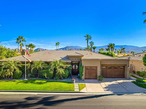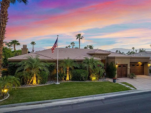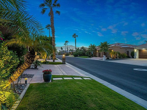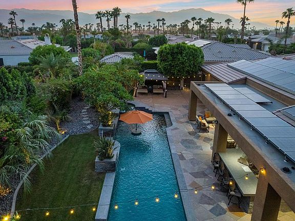 Welcome to Sunterrace, an Upscale gated community nestled in the heart of Palm Desert. This meticulously REMODELED GRANVILLE model offers four spacious bedrooms, 2.5 bathrooms, and an expanded three-car garage, all resting on an oversized SOUTH-FACING interior lot. This luxurious oasis is surrounded by lush tropical landscaping and mature trees, creating a private retreat perfect for entertaining. The kitchen showcases New upgraded cabinets, Porcelain countertops, and stainless steel appliances, including a Viking range, two wine coolers and a filtered ice maker. The gourmet kitchen opens to a sunlit breakfast nook and a large family room with a custom stone-stacked fireplace-surround and bar. Upgraded lighting, tile flooring, and an integrated speaker system with SONOS sound throughout enhance the interior and exterior ambiance. The master suite boasts an opulent ensuite with a soaking bathtub, a spacious walk-in glass shower and huge walk-in closet with custom cabinets. Custom white wood shutters adorn all windows and sliders, framing views of the ultra-private outdoor oasis. This entertainer's dream features a custom-designed pebble tec SALTWATER pool and spa, tranquil waterfalls, lush greenbelts, mature tropical landscaping, a custom glass and lava rock fire pit, and a built-in barbecue under an expansive custom-covered patio. This SEMI-CUSTOM home also includes leased SOLAR PANELS, a tankless water heater and low HOA dues of $172 per month.