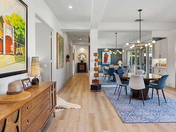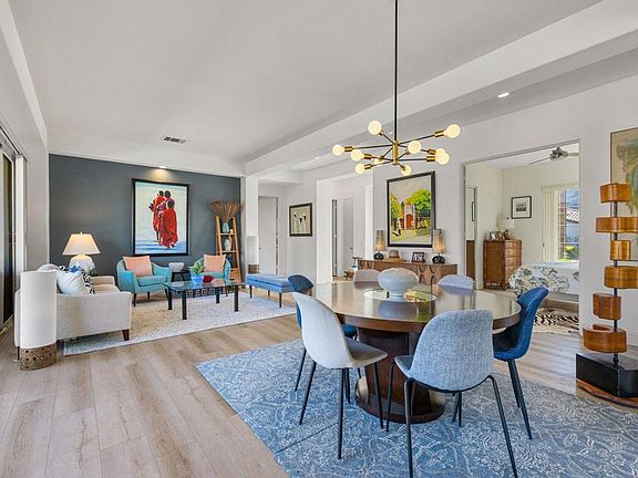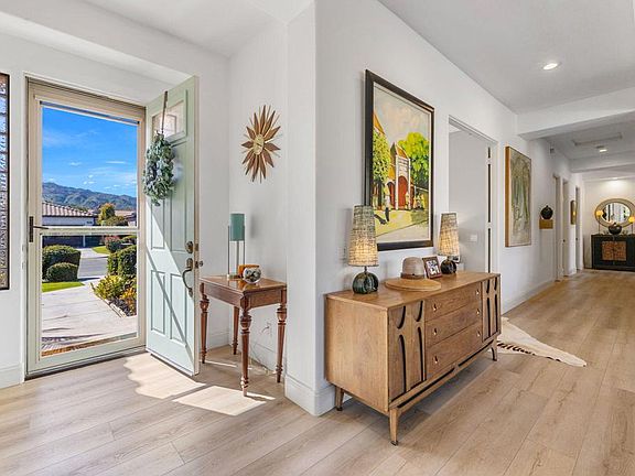 Nestled in the sought after gated community of The Sundance in Indian Wells is this beautifully updated home with awe-inspiring Mt. Eisenhower views. Upon entering you'll be welcomed with high ceilings, new laminate wood flooring and freshly painted interiors. The open living and dining rooms look out to your private saltwater pool/spa with cascading waterfalls, numerous covered conversation areas, lush landscaping, and a variety of mature fruit trees. The remodeled gourmet kitchen with quartz counters, kitchen island and backsplash, new high-end appliances, pendent lights, and refinished cabinetry is a chef's delight and adjoins the den with fireplace and breakfast nook.The primary suite is a private retreat boasting a stunning redesigned bathroom with large walk-in closet. Two more guest suites share yet another renovated bathroom, plus an additional office, (4th bedroom or yoga studio!), close to the laundry room. The 2-car garage has epoxy floors, extra storage with direct access to the home. Indian Wells offer its Residents many great discounts and privileges including; golf at the IW Resort, BNP Paribus Tennis Open and Indian Wells resort hotels.