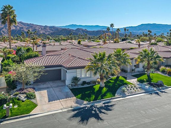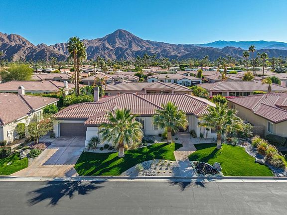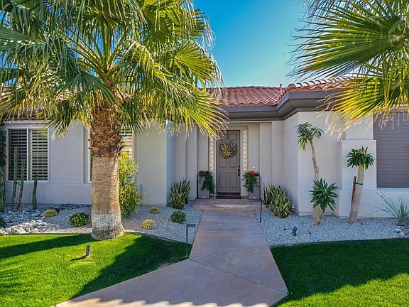 This contemporary Mediterranean-style residence is in the intimate gated enclave of Sundance, in the heart of Indian Wells. Professionally designed accent-lighted desert landscaping surrounds the home adding to impressive property appeal. Beautiful palm trees and other varietals create a pleasant environment consisting of low-maintenance plantings throughout the grounds. An expanded rear patio has a southern orientation that maximizes the all-day sunlight. A pergola design-element with heater, fans, soothing fountain, adjacent gas fire pit, and built-in BBQ enhances outdoor entertainment. The salt-water pool with spray water features, accent lighting, and cascading spa have been resurfaced with mini pebble-tech. Porcelain tile flooring has been installed throughout the main living areas that include a formal living room and dining area. The open kitchen, breakfast nook, and family room area has been enlarged from the original square footage by adding approximately 60 SF by moving out the back wall to create an expanded great room. The kitchen features slab granite counter tops, back splashes, island with sink and breakfast bar, and newer upgraded stainless appliances. The family room focus is a custom designed contemporary gas fireplace with a flat screen TV above. The home's interior floor plan consists of two primary bedroom suites on each side of the home, with a third potential sleeping area that is currently designed as an office/den space. The Primary bedroom has wood-like vinyl flooring, and the bath and shower area were upgraded with contemporary cabinetry and porcelain tile flooring and walls.