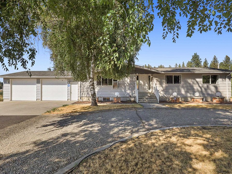 Great Location! This unique 4.8 acres surrounds this lovely 3 bed, 3 bath daylight walk-out rancher. New vinyl wood floors, baseboard trim & main living paint. This main floor living home has custom built-in cabinets, vinyl & alum windows, radiant ceiling heat, and baseboard heat in basement; in-window A/C; large pantry and laundry off kitchen. Main suite has adjoining bath with large built in closets. Basement is finished and ready for entertaining including a built in wet-bar area with refrigerator and sink, potential for an additional non-conforming bedroom. Basement walks out to lower yards attached fenced area. Large deck with prairie view and firepit at back of property. New driveway; 2 car attached garage and additional 1 car attached garage perfect for a workshop. Property equipped for animals, shop or small farm. Home has old sprinkler system and has not been used since 2020. Property overlooks private lot with plenty of parking. With a little TLC this home will be amazing!