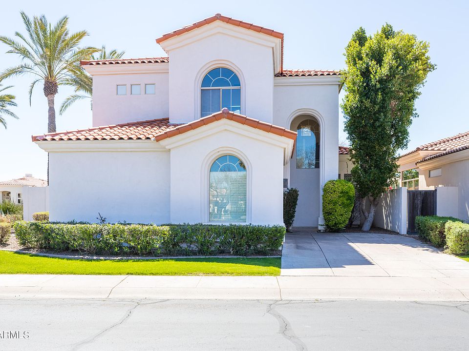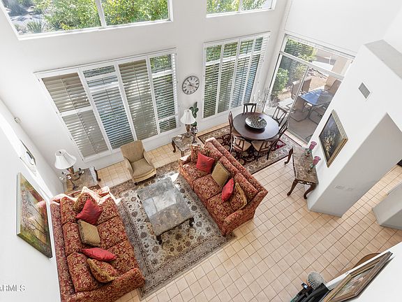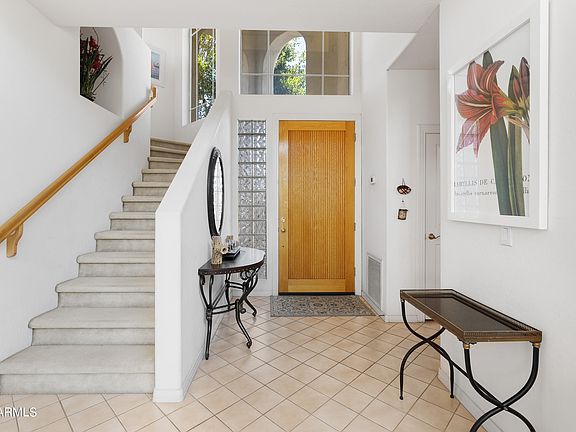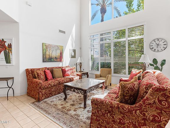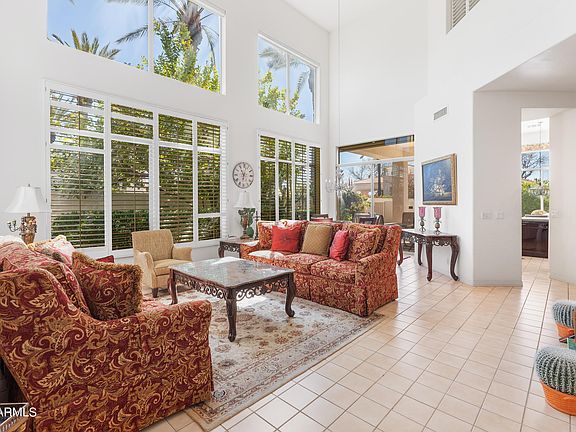 Gracious family home with soaring ceilings in the heart of one of Scottsdale's best guard-gated communities. Large open living room with plenty of windows for natural light and views of lush landscaping. Spacious kitchen and wonderful breakfast area in addition to formal dining. Downstairs primary bedroom with nicely appointed bathroom and huge closet. Sliding door to patio provides a nice view of fruit trees and flowering plants. Powder room near the front entrance and another full bathroom upstairs to be shared by the two additional bedrooms. One of the upstairs bedrooms has a nice view of the park and mountains in the distance. Additional seating/TV area upstairs and separate office space. Resort-style community with massive swimming pool and deck area, tennis and pickleball courts in addition to ping-pong table and outdoor gas grill. Truly one of Scottsdale's best locations with easy access to Scottsdale Fashion Square, Old Town, Aj's gourmet grocery in addition to many upscale restaurants and the new Paradise Valley Ritz Carlton resort.